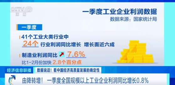 国家统计局发布的数据显示,一季度全国规模以上工业企业实现利润总额15093.6亿元,同比增长0.8%,扭转了自去年三季度以来企业累计利润持续下降的态势。